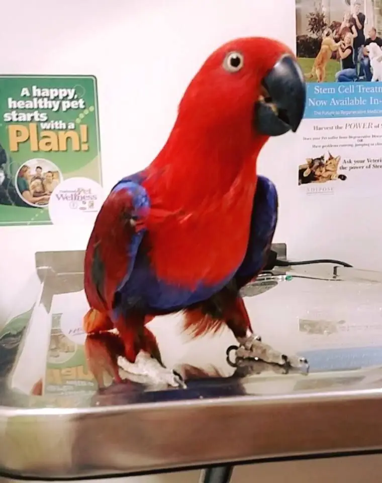 Hannah is a gorgeous type of parrot called an Eclectus. Don't get to see them every day! They are one of the few species with completely different marking than their male partners, who are green!